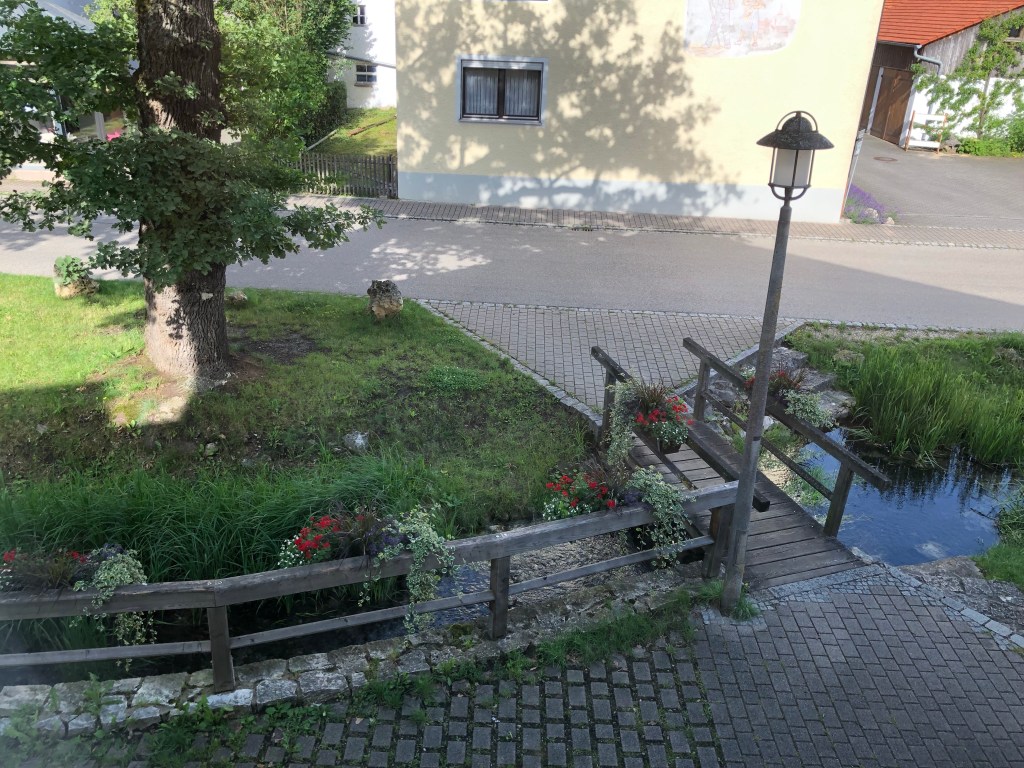 We worden een stukje terug op de route gereden. Dan komen we aan bij de autogarage die toevallig net dicht is. Er wordt niet meer gesleuteld, dus we moeten wachten tot de volgende dag. Ons geboekte hotel moeten we annuleren, de autogarage-administratiedame regelt een hotel voor ons in het dorpje Kinding. Op loopafstand van onze auto. Zo laten we hem toch niet helemaal in de steek. Het hotel is fijn, er loopt een beekje langs wat ik in mijn hoofd als rivier bestempel, zo voelt het extra mooi! We nemen plaats op het terras en proosten op dat we veilig zijn en dat we geen gevaarlijke dingen zijn gebeurd. We hebben geluk gehad bij deze pech. Na 2 goede snitzels gaan we op wandelavontuur en na 3 kwartier voelt het alsof we het hele dorp gezien hebben. Een kerk met een begraafplaats, een kinderopvang, basketbalveldje, stoeltjes aan het water, wat hotelletjes, een supermarkt en een aantal mensen.