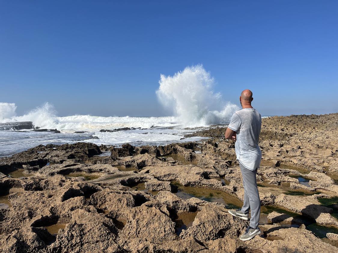 Aan de kust zelf genoten we van het schouwspel van de wilde zee. Telkens klotste de golven hard tegen de rotsen en spoot het water hoog in de lucht. Wanneer het eb is, kun je de hoge rotsen in en vanaf daar over de zee kijken. Wij waren er toen het net vloed was dus wij zijn de rotsen niet in geweest. Op het strand verkocht men zeevruchten vanuit kraampjes. En vormden zich voor onze neus terrasjes van plastic stoelen. Af en toe moesten we een quad ontwijken en mensen die aan het paardrijden waren. Kortom, een levendig gebied, waar je je niet hoeft te vervelen.